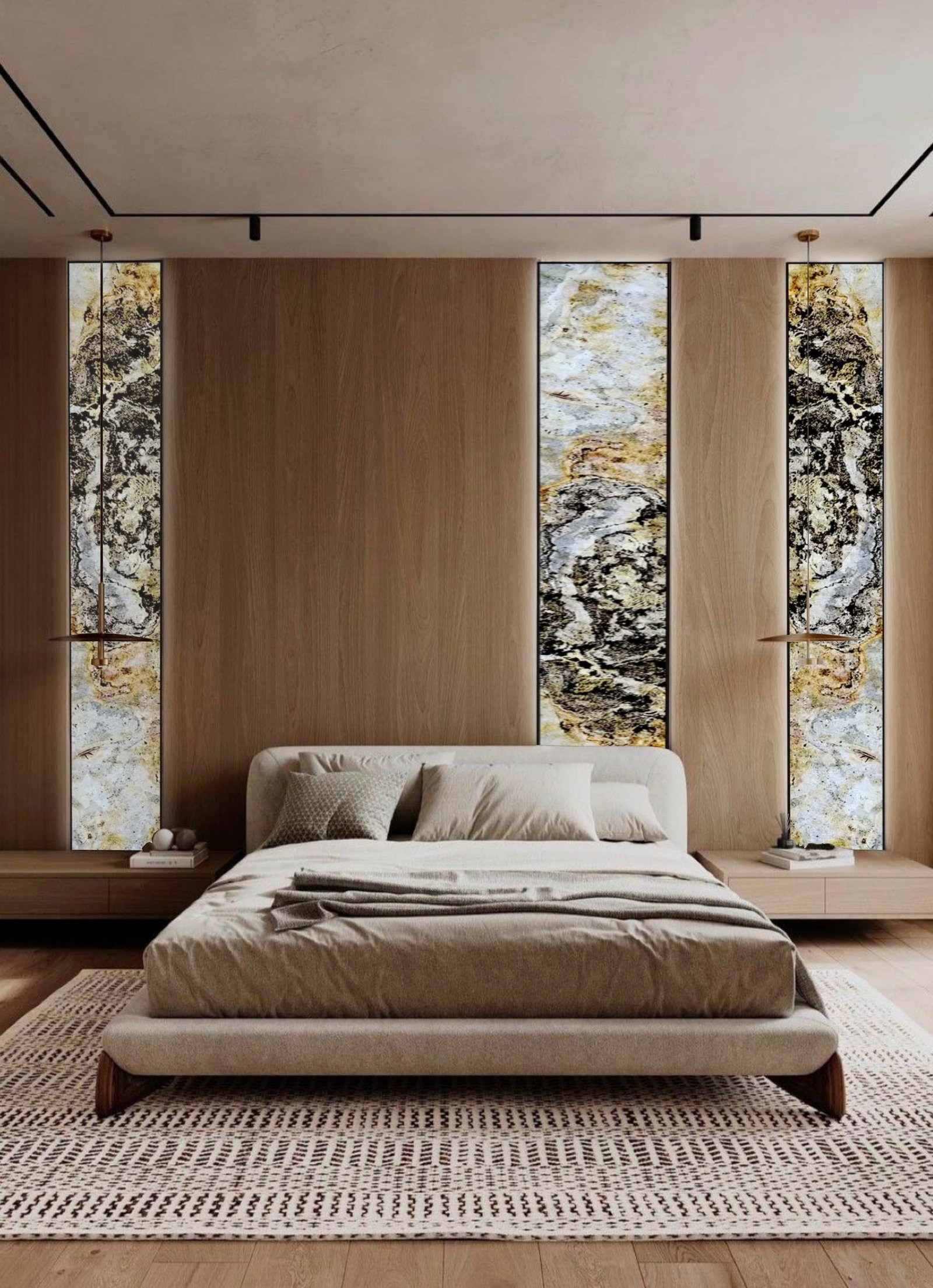 Dokonalá symetrie přírody a moderní techniky. Na snímku vidíte naše svítící kamenné panely, které kombinují tenkou vrstvu pravé břidlice s nosnou epoxidovou pryskyřicí. Díky použití vysokosvítivých LED s posunutou teplotou světla jsme eliminovali nažloutlý nádech a nechali vyniknout realistickou barvu a strukturu kamene. Celý systém působí na stěně velmi subtilně a lehce.